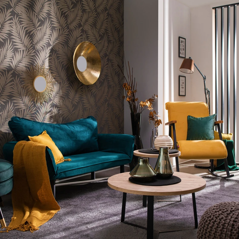 Takođe, ukoliko u stanu imate zidove u tamnijoj boji, prostor ćete oplemeniti i sigurno učiniti svetlijim ukoliko unesete u stan detalje u žutoj boji. Savršeno bi se uklopila fotelja na ljuljanje YOKA, ili dekor u zlatno žutoj boji. Odlično rešenje da ublažite intenzitet žutih zidova jesu i fenomenalne zidne police VKS-80026, ili VKS-80052, konstrukcija im je metal crna i odličan kontrast prave zidu u žutoj boji.