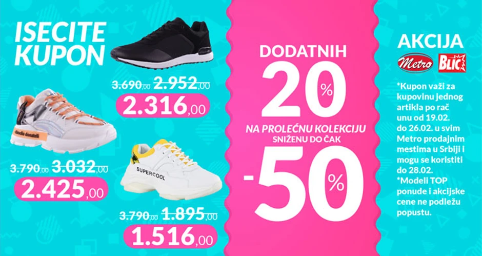 "Blic" i "Obuća Metro" nastavljaju akciju i ove nedelje svakog dana, sve do 26. februara, jer vas u svakom izdanju do petka čeka vaučer koji donosi popust od dodatnih 20 odsto na kupovinu celokupnog asortimana već sniženog do 50% u svim radnjama “Obuće Metro” širom Srbije.