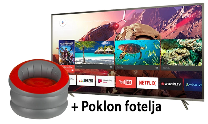 Iskoristite neverovatnu priliku da svoj dnevni boravak upotpunite velikim TCL Android 4K Ultra HD televizorom od 65 inča, a za još veći užitak na poklon dobijate fotelju! Najnovija verzija Android TV smart sistema, koja podržava Google Play, Chromecast built i glasovnu pretragu donosi vam potpuno novo iskustvo kada je u pitanju gledanje omiljenih TV kanala. Ovaj TV dijagonale 165cm može biti vaš za 97.999 dinara kupovinom na akciji samo na gruppi.rs.