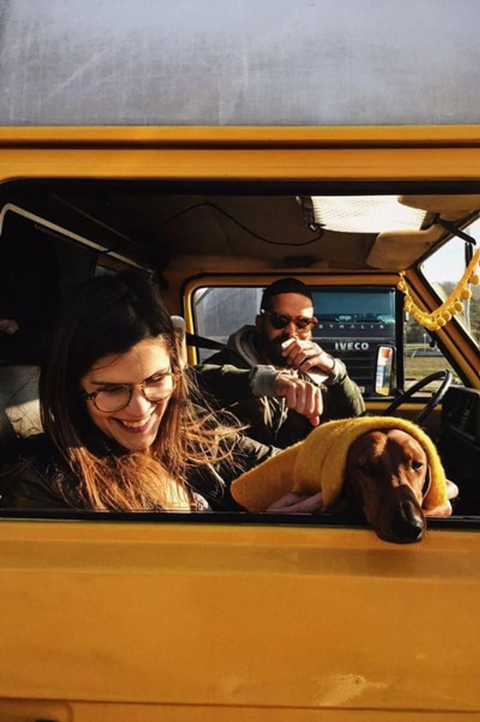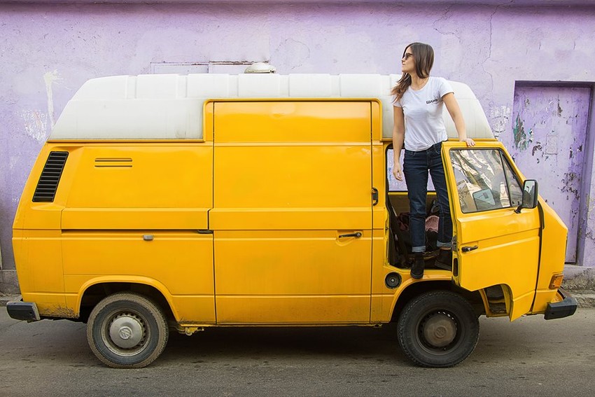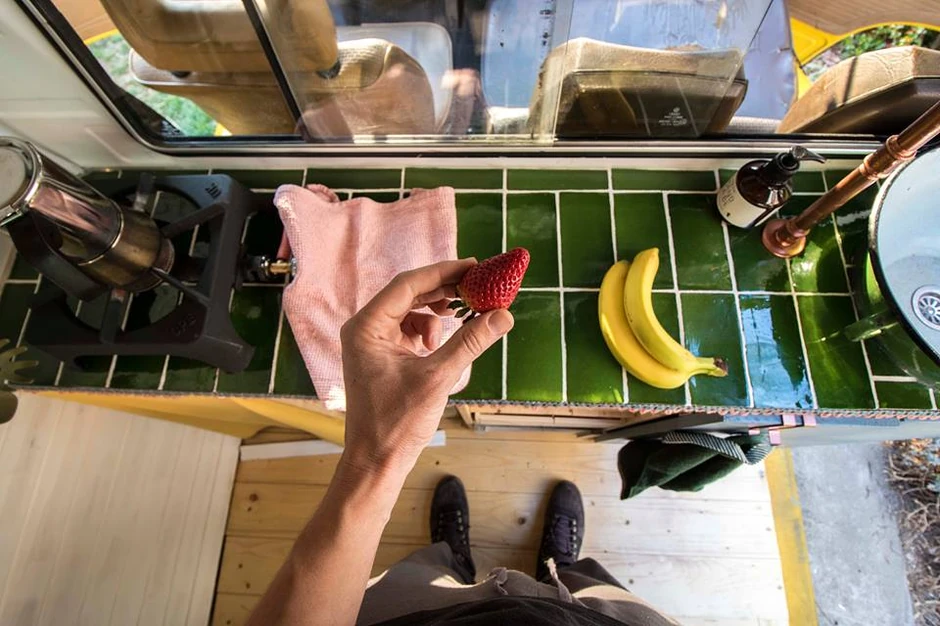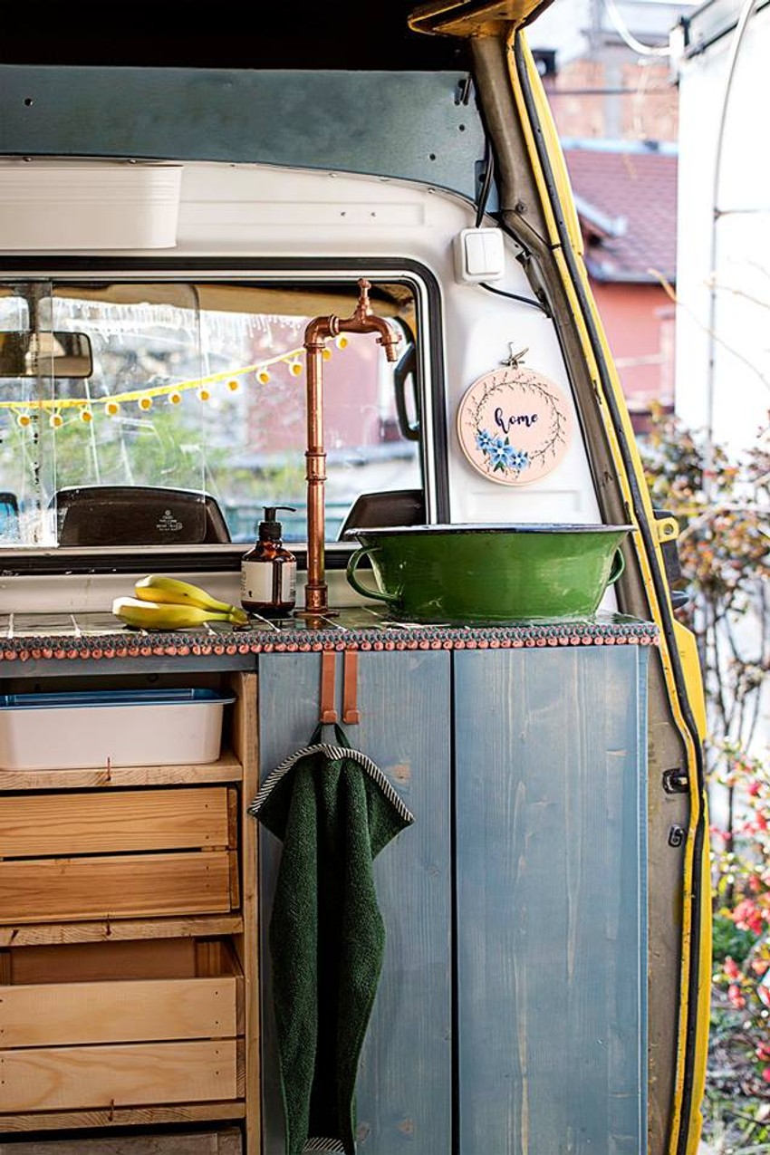 - Kad smo ga videli, odmah je palo zaljubljivanje u njegov retro izgled i limun boju. Pošto je prostor prilično skučen, morali smo dobro da promislimo svaki kvadratni centimetar, od ukupno 4kmv koliko ima tovarni prostor. Ukrali smo vanglu za branje trešanja od Anjine bake i od toga napravili sudoperu. Ove godine imamo brodski pod, tekuću vodu, smaragdno zelene španske pločice ventalaciju i jaču solarnu lampu, tako da smo prošli feng šui inspekciju. Opet nemamo grejalicu, pa ćemo se i dalje grejati na našeg jazavičarskog kompanjona Šnjura.
