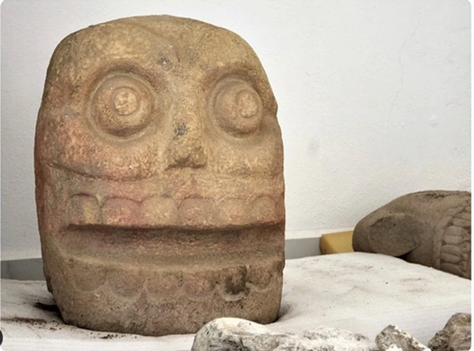Dve slične lobanje isklesane u kamenu i torzo predstavljaju boga Šipea Toteka, jednog od najvažnijih prehispanskih božanstava.