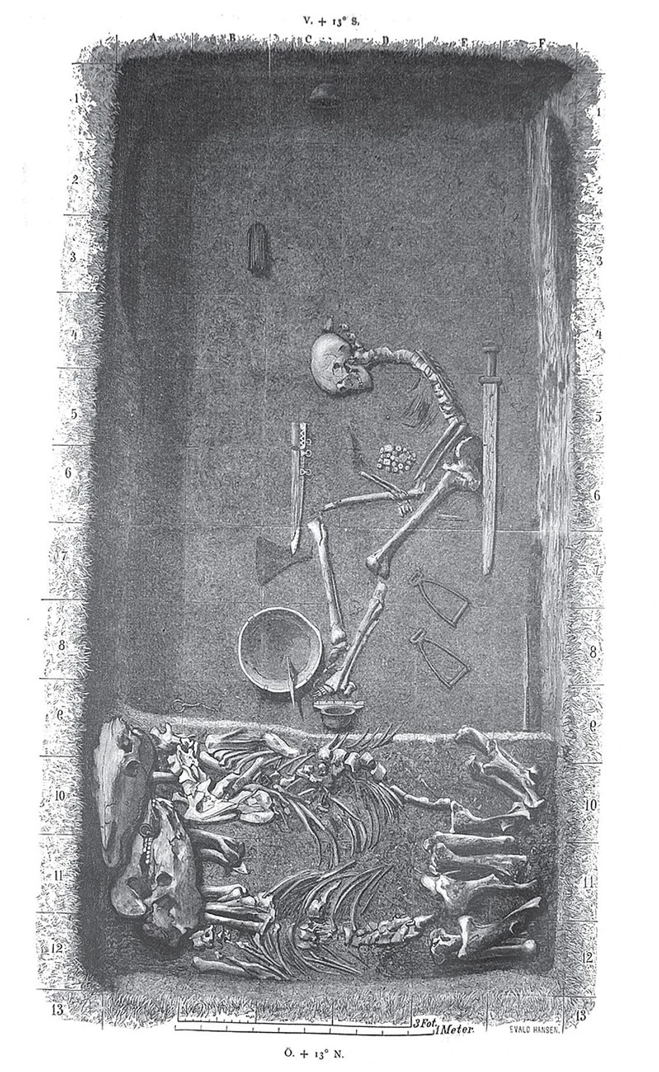 U grobu je pored kostura pronađeno puno oružja, tabla za kockanje sa žetonima od kamena kao i kosturi dva konja od kojih je jedan bio sa opremom za jahanje. Arheolozi su zaključili da je to bio grob nekog veoma moćnog i bogatog ratnika.