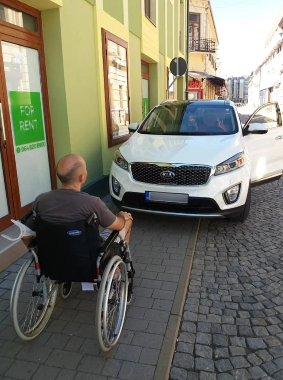Telefonira, jede i sedi u autu parkiranom na trotoaru, praveći se da ništa ne primećuje - tako se poneo jedan zrenjaninski vozač, dok je drugi muškarac u invalidskim kolicima morao da siđe s trotoara na kolovoz i obiđe parkiranog.