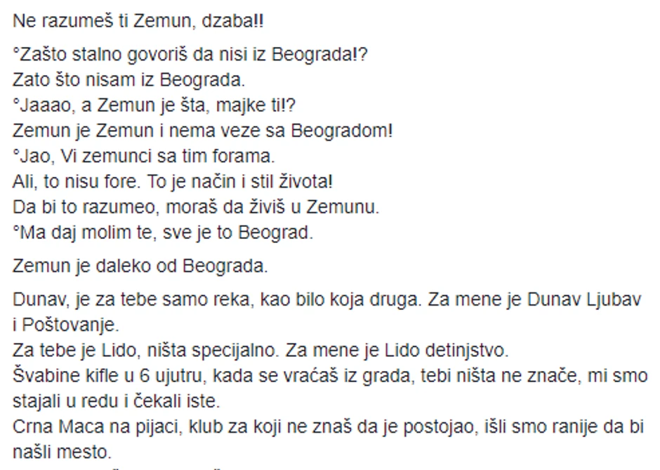 "Ipak zaslužuje da svi čitaju", napisala je Miljana na kraju statusa koji je oduševio sve one koji se zovu Zemuncima, ali i one koji "čak" iz Beograda i drugih delova grada rado dolaze na reku, gde život nekako sporije i lepše po površini Dunava plovi.