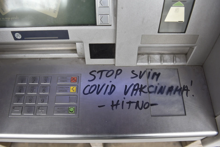 Na bankomatima u centru grada od sinoć do jutros osvanulo je preko 30 različitih poruka uznemirujućeg sadržaja koje prenose poruke protivljenja imunizaciji koja se trenutno sprovodi u Srbiji.