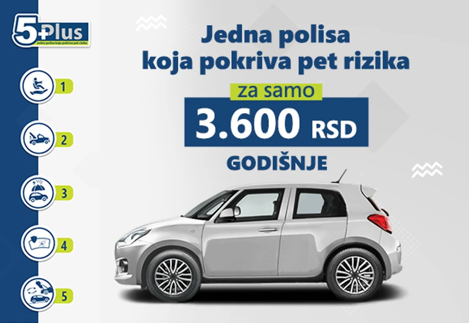 Sa druge strane, ako tražite osiguranje automobila za manji budžet, u ponudi Milenijum osiguranja je i polisa Paket 5+ . Ova polisa pokriva pet najčešćih rizika, osiguravajući Vas, Vaše vozilo i putnike u njemu za svega 3.600 RSD godišnje.