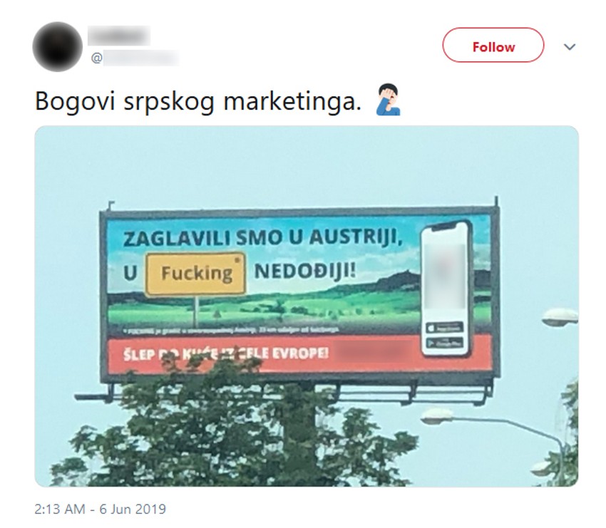 Naime, iako i na srpskom i na engleskom jeziku reč Fu*ing označava jednu od najčešćih psovki, u ovom slučaju se ipak radi o selu u Austriji koje se, verovali ili ne, zove Faking.