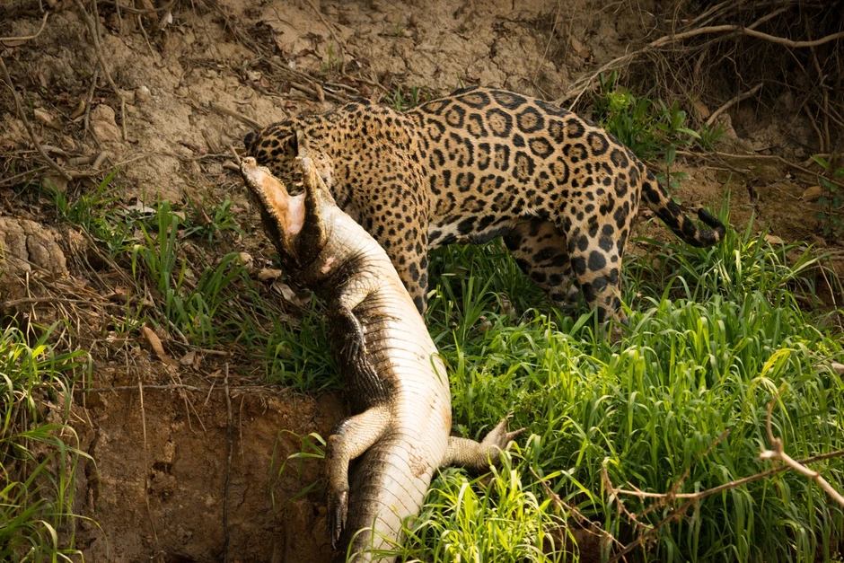 Fotograf životinja Kevin Duli snimio je neverovatni trenutak sukoba jaguara i kajmana (gmizavac iz familije aligatora). Nakon što je velika mačka skočila sa drveta – sa visine od tri metra – na leđa reptila, usledila je borba do smrti.