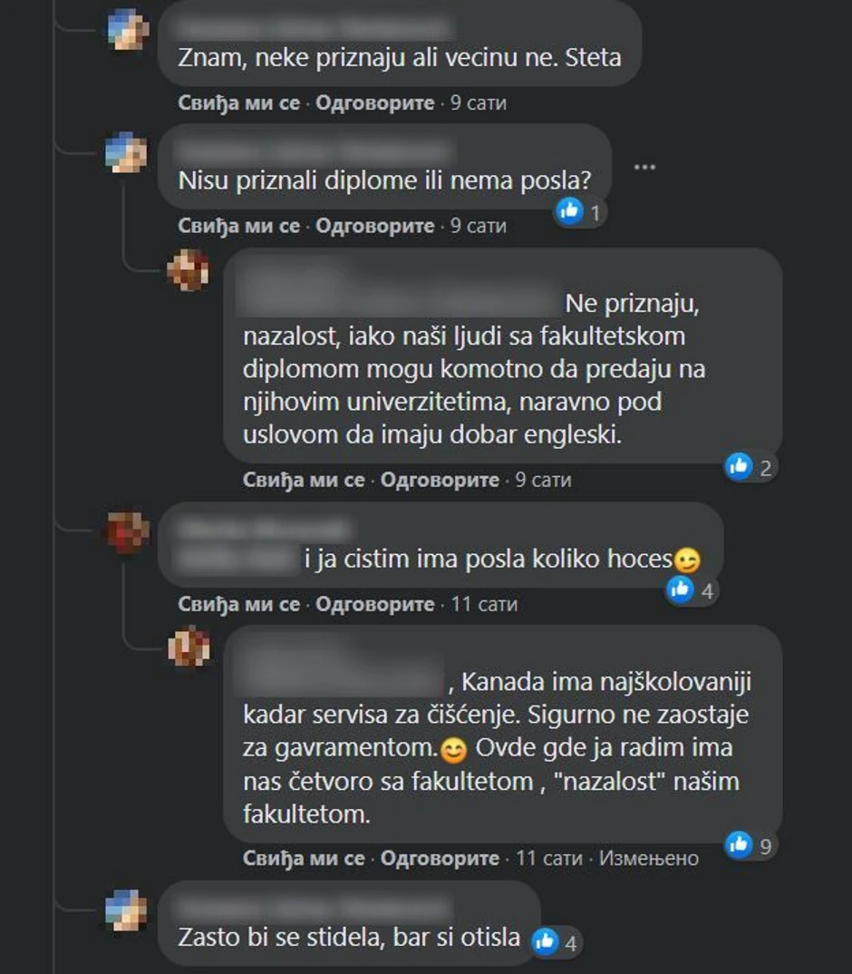 "Da vam odmah bude jasno, u Kanadi nema to - lekar, apotekar, ekonomista i tako dalje. Budite spremni da od diplome odmah leba nema. Proces da radite u struci je dug, za neke nedostižan ali se i od drugih poštenih poslova može živeti i priuštiti lep život za porodicu", rekla je ova žena i istakla da u Kanadi živi mnogo bolje nego što bi to bio slučaj da je radila u struci i ostala u Srbiji.