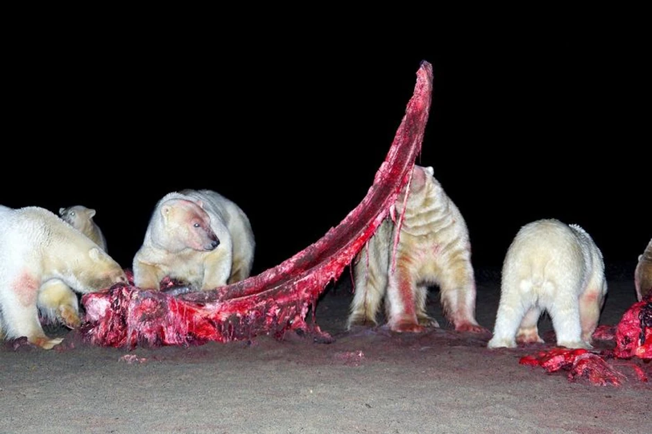 Medvedi su na to mesto došli da bi se osladili komadima mesa sa leša nasukanog grenlandskog glatkog kita, a posle su se odmarali u neposrednoj blizini. Među masom medveda bilo je i mnogo "medveđih porodica", uključujući dve medvedice koje su imale po četiri mladunca u pratnji, što je prava retkost.