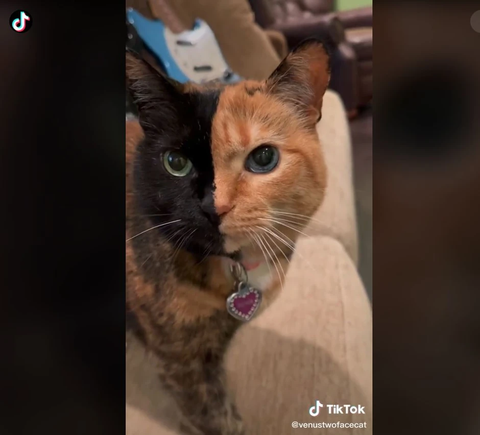 "Dvobojno" lice posledica je genetskog poremećaja, a životinje koje ga imaju nazivaju se himerama. Sada dvanaestogodišnju Venus su vlasnici pronašli kao mače 2009. godine u Severnoj Karolini i odmah je zavoleli zbog njene neobične prirode.