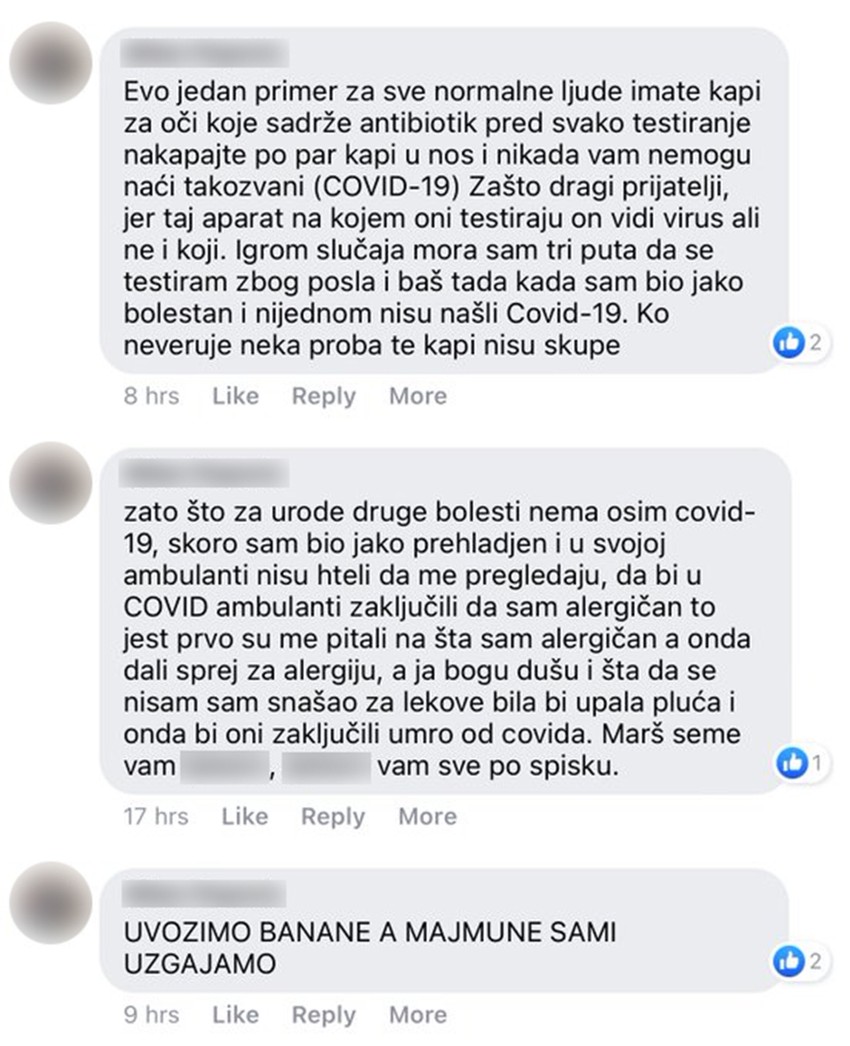 "Ovo je za zatvor", "Ovo za majmune je u pravu, pokazao na ličnom primeru", "Što je najstrašnije, ljudi veruju u ovo i lajkuju. Još tragičnije", "Uzmi antibiotik protiv virusa, šta ti nije jasno", glasili su neki od komentara.