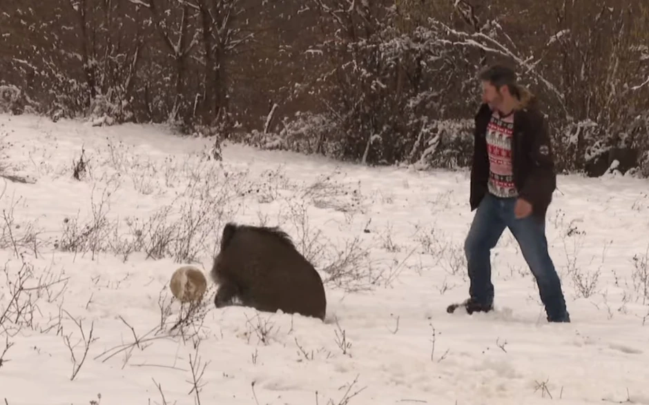 Korona, kako glasi ime prijateljski raspoloženoj i pripitomljenoj divljoj svinji, izgleda da prija sneg koji je pao u Hrvatskoj, te je tokom razgovora Dušana i novinarke portala "Dnevnik.hr", veselo trčkarala oko njih.