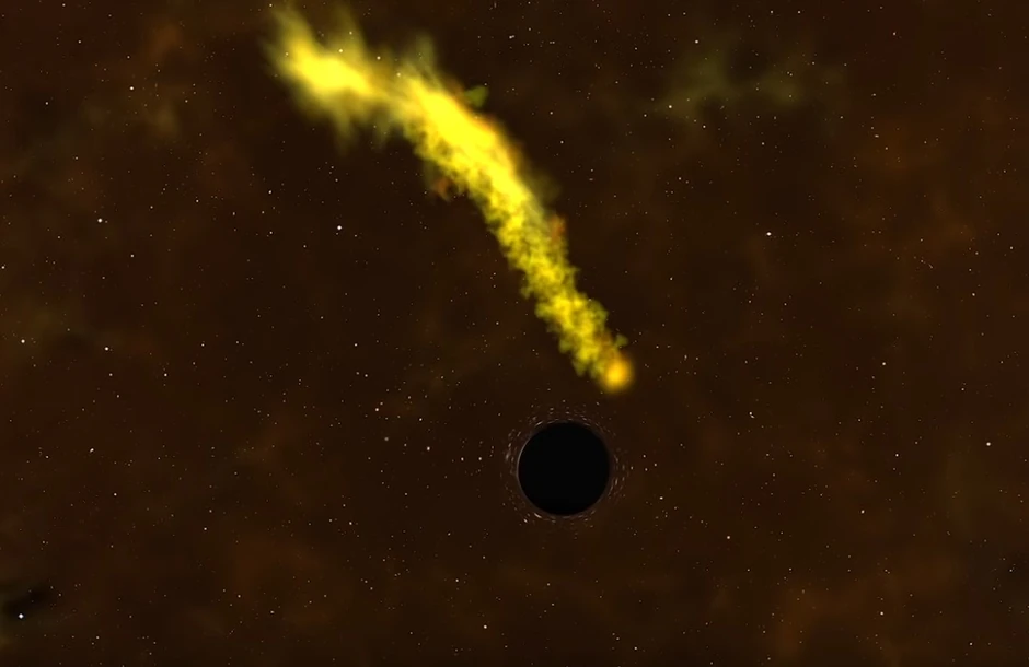 Kad se zvezda previše približi crnoj rupi, intenzivna sila je razbije u tok gasa, čiji rep beži dok se ostatak uvrće oko svemirskog čudovišta, okružujući ga diskom otpada.