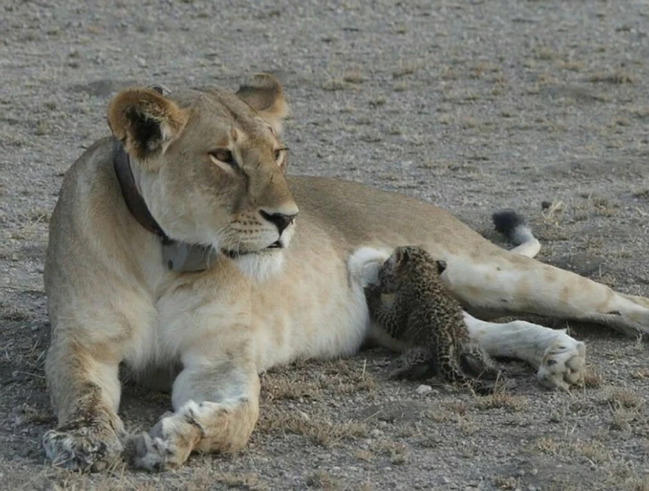 Mladunče leoparda je uzrasta kao i mladunčad lava. Pronađeno je pored njenih mladunčadi. Tretira ga kao svoje, štiti ga i hrani.