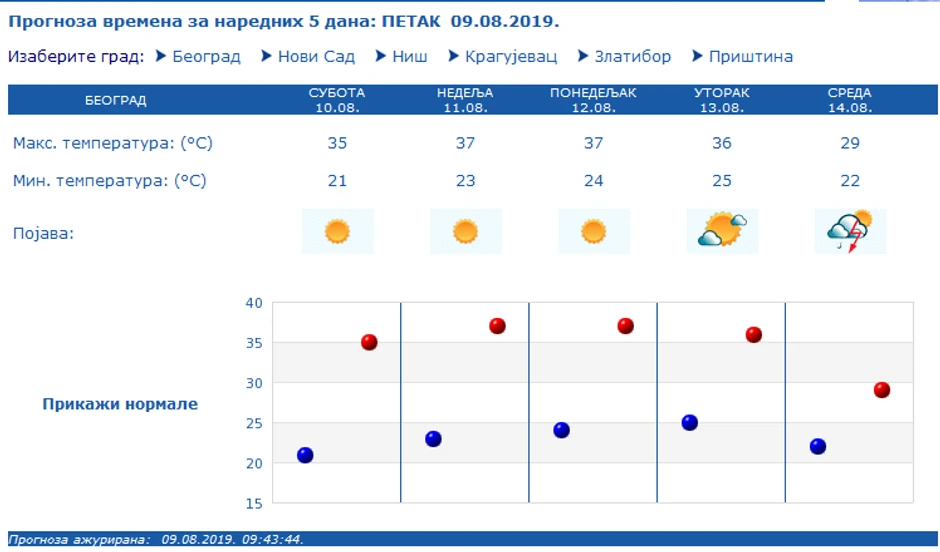 Još danas možemo da odahnemo, jer nam već od sutra sledi pravi toplotni šok. Republički hidrometerorološki zavod izdao je uopozorenje da se do utorka očekuju vrlo visoke temperature na području naše zemlje, kada će živa u termometru ići od 34 do 38. podeoka, a ponegde i 40!