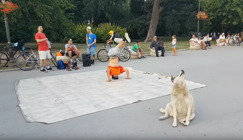 Dečaci koji su igrali brejkdens privukli su četvoronožnog posmatrača, koji je dobio inspiraciju i sam zaplesao.
