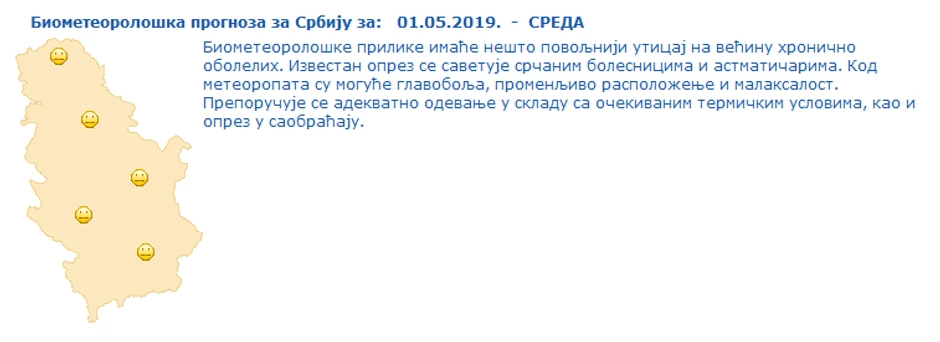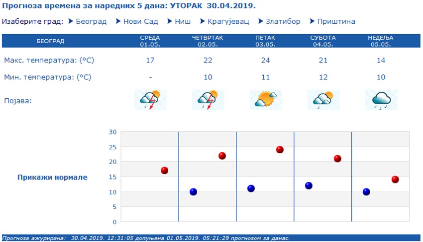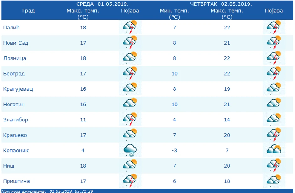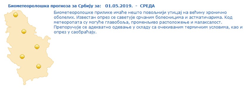 Poslepodne biće promenljivo oblačno sa uslovima za lokalne pljuskove i grmljavinu. Vetar će biti slab i umeren, na istoku i na planinama povremeno jak, zapadni i severozapadni. Jutarnja temperatura od pet do devet stepeni, najviša dnevna od 15 do 18.