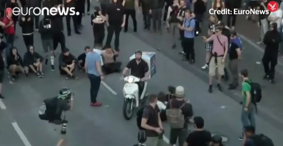 Na snimcima lokalnih medija vidi se kako dostavljač neometan krivuda između mase okupljenih na protestima pod nazivom "Dobrodošli u pakao" gde je povređeno više desetina ljudi.