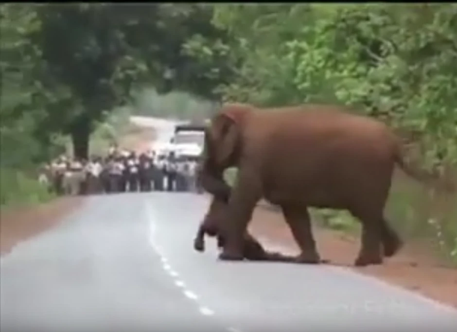 Kolonu predvodi odrastao slon, verovatno majka, koja nosi mrtvo mladunče kroz šikaru, da bi ga potom, praćena sa još najmanje osam slonova, prenela preko ulice. Potom spušta telo na ivicu puta, a zatim joj se pridružuju ostali. Pošto su se svi okupili, zajedno sa telom odlaze u šumu.