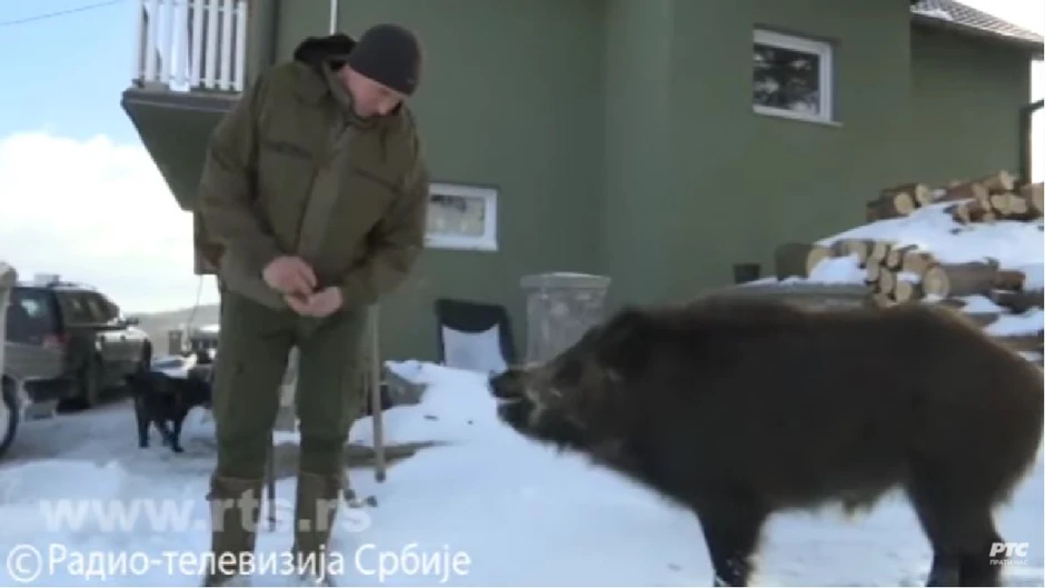 U dom porodice Avramović, Gile je došao sa dva kilograma, a sada ima više od stotinu. O tome koliko se ova divlja životinja pripitomila i odomaćila govori i to da i na nas strance reaguje potpuno pitomo.