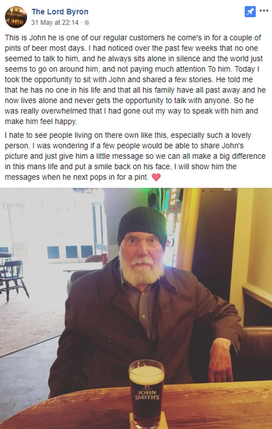 - Ovo je Džon. On je jedna od naših stalnih mušterija, uvek dolazi na pivo. Kroz poslednjih nekoliko nedelja primetio sam da niko ne razgovara sa njim, on uvek sedi sam u tišini, a svet kao da prolazi pored njega i ne obraća mnogo pažnje. Danas sam uhvatio priliku da sednem i da popričam sa Džonom. Rekao mi je da nema nikoga u životu, da su mu svi u porodici umrli i da sad živi sam i nema baš mnogo mogućnosti da sa nekim razgovara. Zbog toga mu je bilo zaista drago što sam se potrudio da popričam sa njim i učiniti ga na taj način srećnim. Mrzim da vidim da ljudi žive sami, pogotovo ovako dragi ljudi. Zanima me možete li da podelite Džonovu fotografiju i poslati mu kratku poruku tako da napravimo promenu u životu ovog čoveka i vratimo mu osmeh na lice. Pokazaću mu poruke kad navrati na piće, piše u objavi koju je napisao Ben.