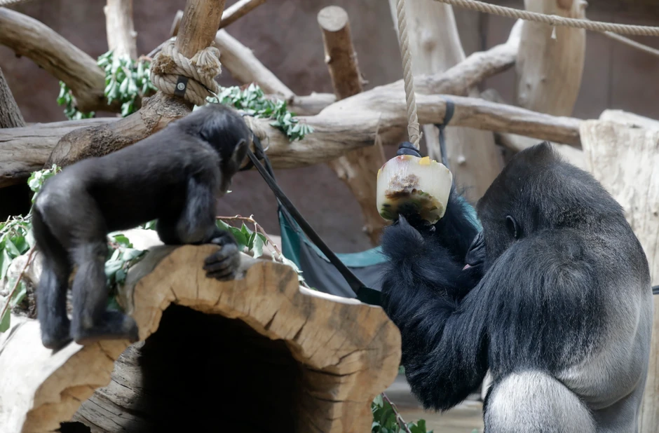 Čuvari u zoološkom vrtu pokušali su juče nešto drugo da ponude gorilama, dali su im dve kocke smrznute vode pomešane sa raznim voćem koje vise na konopcima u njihovim staništima.