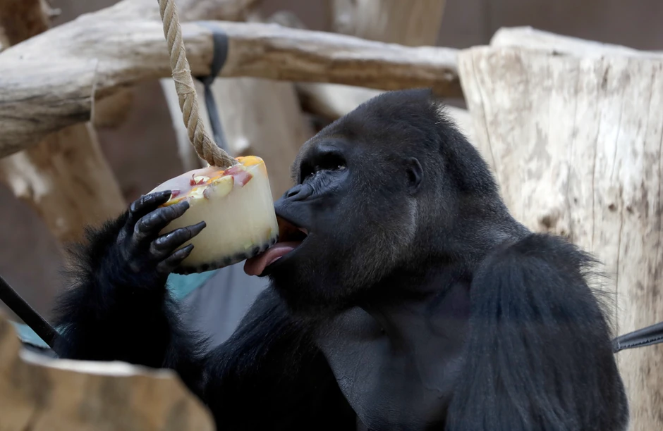 Gorile u praškom zoološkom vrtu tokom talasa vrućine koji je zahvatio Evropu rashalđuju se jedući sorbe.