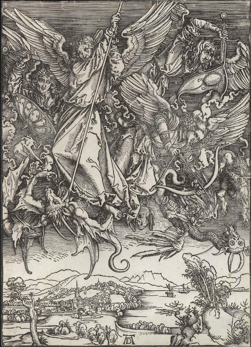 - I posta rat na nebu. Mihailo i anđeli njegovi udariše na aždaju i bi se aždaja i anđeli njeni. I ne nadvladaše i više im se ne nađe mesta na nebu. I zbačena bi aždaja velika, stara zmija, koja se zove đavo i satana, koja vara sav vasioni svet, i zbačena bi na zemlju i anđeli njeni behu zbačeni sa njom – "Otkrovenje" 12, 7-9-
