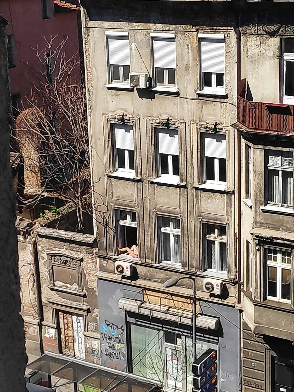 Anonimna Beograđanka, jutros je rešila da joj aktuelno stanje zbog virusa korona ne pokvari uživanje, te je umesto da se rizikuje svoje zdravlje odlaskom u neki od parkova i izletišta Beograda, ostala kod svoje kuće sa namerom da se dobro zabavi, pa i osunča dok vreme provodi uz knjigu. Ona je jednostavno iskoristila raspoložive resurse u vidu prozora, na čiji je donji deo stavila peškir i "donela plažu" u svoj dom u jednoj od prestoničkih ulica.