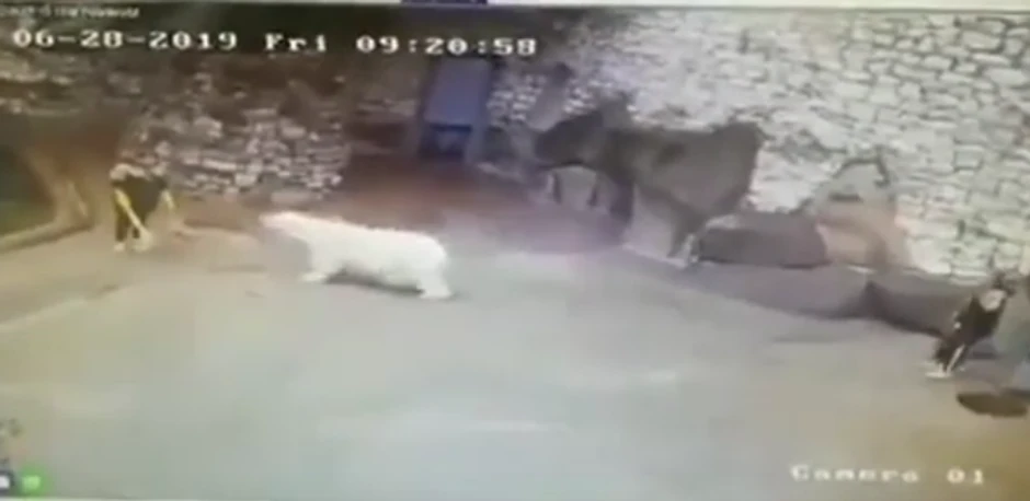 Na snimku se vidi kako jedna od žena odlazi žurnim korakom, da bi se u sledećem trenutku pojavio medved i prišao drugoj, koja je ostala u kavezu.