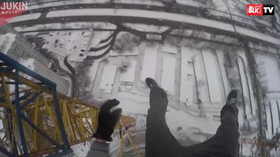 Jedan muškarac iz Rusije popeo se na vrh krana i odlučio da tu uradi nekoliko zgibova, i naizgled bez straha visi dok se ispod njega vidi snegom prekriven grad.
