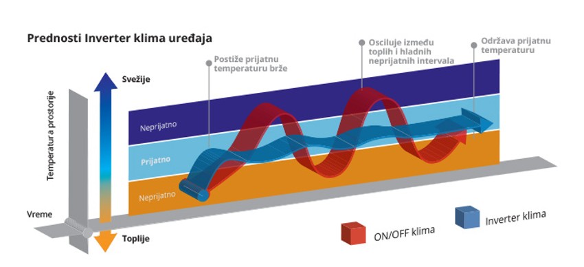Inverter, zahvaljujući drugačijem kompresoru u odnosu na standardnu on/off klimu radi održavajući temperaturu konstantnom uz blage oscilacije.