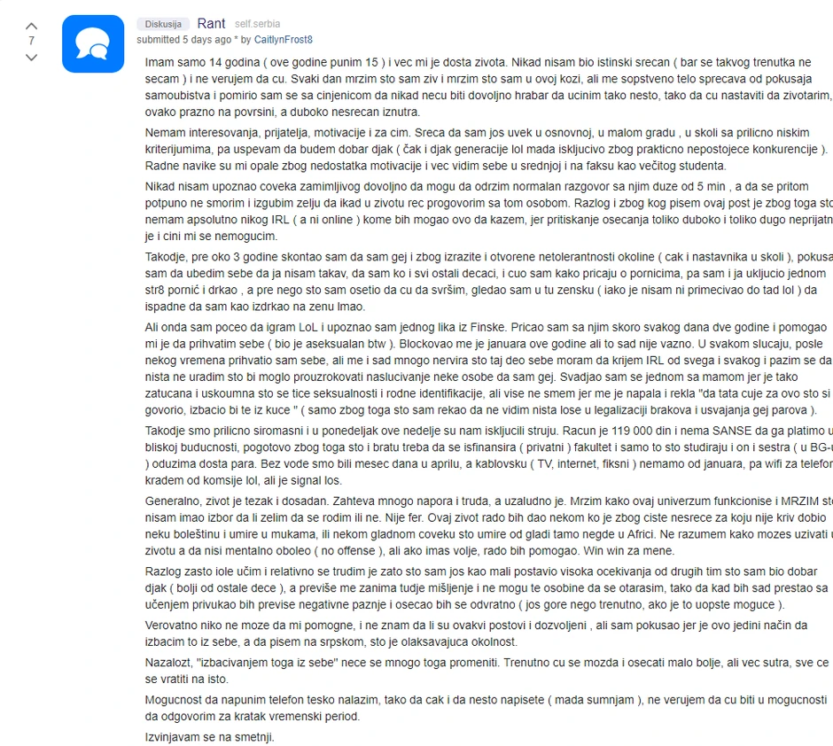 – Imam samo 14 godina (ove godine punim 15 ) i već mi je dosta života. Nikad nisam bio istinski srećan (bar se takvog trenutka ne sećam) i ne verujem da ću – opisuje svoj život ovaj dečko.