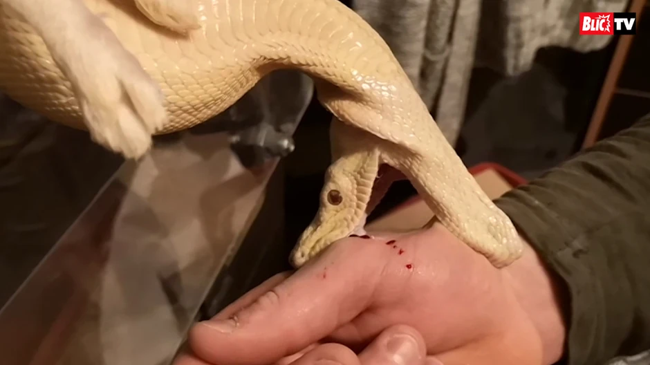 Ovaj video snimak prikazuje trenutak kada je zmija boa zarila zube u šaku svog vlasnika dok ju je hranio.