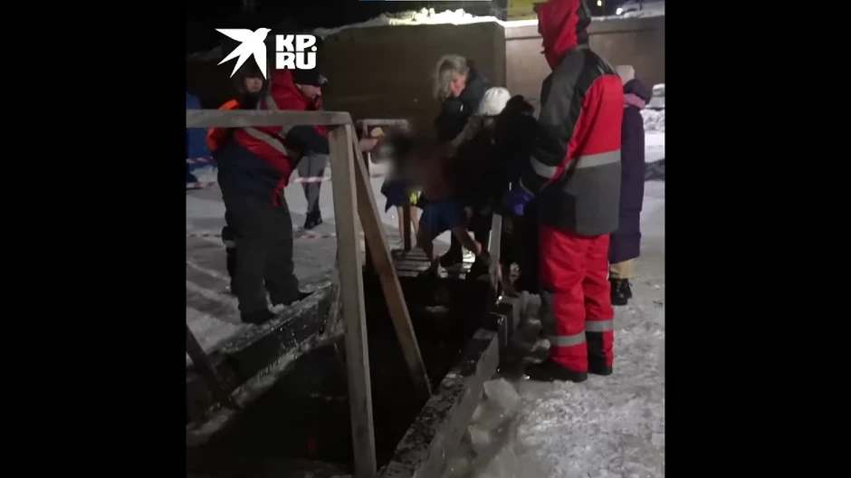 Na snimku zabeleženom u Komsomoljsku u Rusiji na platformi iznad ledene vode vidi se majka kojoj se dete, koje je samo u šortsu, otima iz ruku i nekoliko ljudi koji posmatraju mališanovu reakciju.