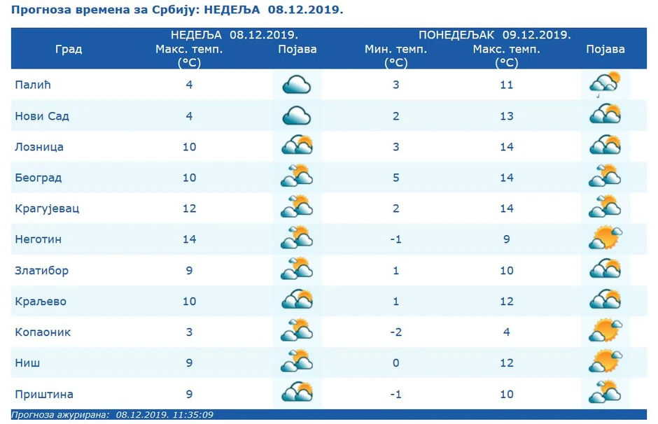 U ponedeljak tokom dana u nekoliko gradova temperatura će biti iznad deset stepeni, s tim da će Novosađani, Beograđani, Lozničani i Kragujevčani uživati na 14 stepeni.