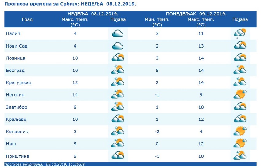 Prema najavama Republičkog hidrometeorološkog zavoda Srbije, posle podne biće pretežno sunčano, sa slabim jugoistočnim vetrom. Najviša očekivana temperatura je 15 stepeni u Zaječaru i Negotinu, a najhladnije u Vojvodini gde temperatura neće prelaziti četiri stepena iznad nule. Čak, Palić će danas sa dva stepena biti hladniji od Zlatibora gde je najavljeno osam stepeni.