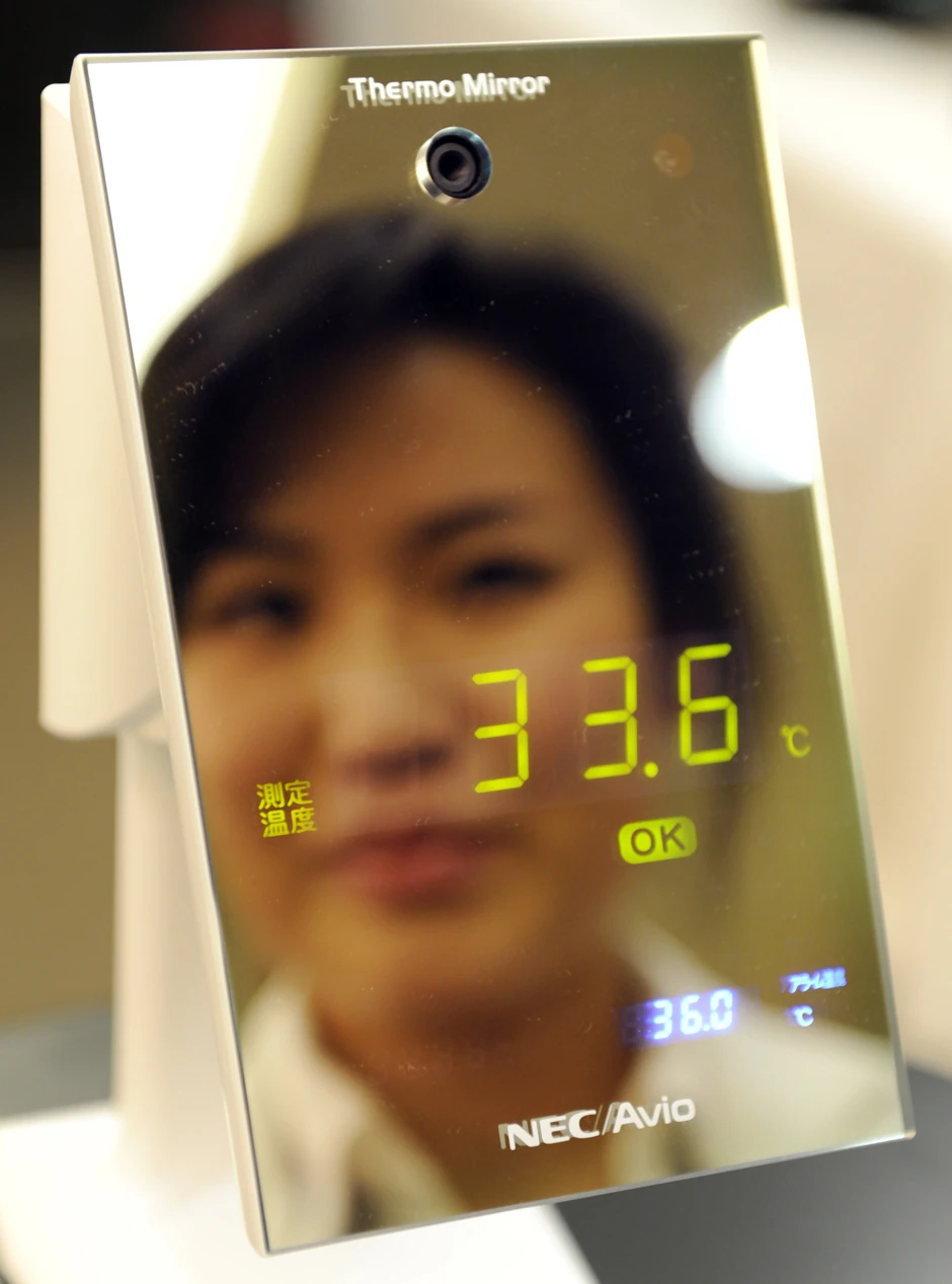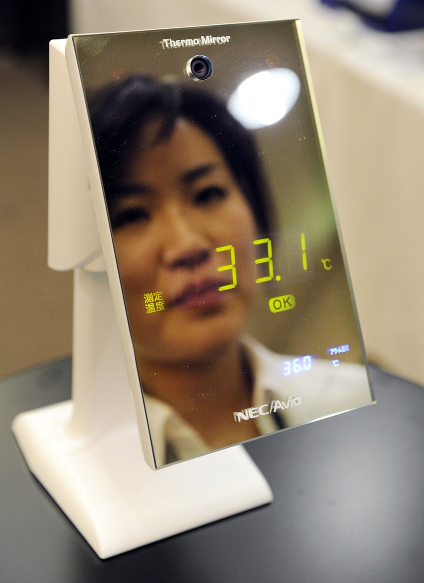 Japanska kompanija NEC/Avio Infrared Teknolodžiks predstavila je u Tokiju ogledalo sa specijalnim infracrvenim senzorom, koji na daljinu meri temperaturu čoveka koji se u njemu ogleda.