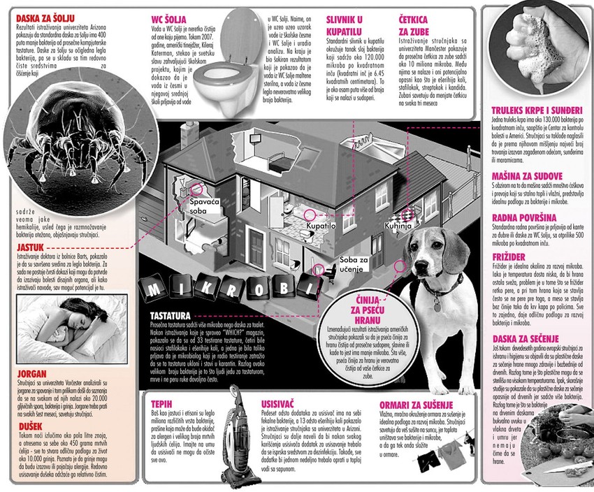 Kada su vidljive golim okom, hitri smo da ih očistimo i operemo. Ali istina je da su najprljavije stvari - barem 99 odsto njih - nevidljive. I dok čistimo mesta kao što su kada i WC šolja, samo mali broj nas obraća pažnju na predmete koji ne izgledaju prljavo - kompjuter, dušek, zavesa... Pa, ipak studije su pokazale da su mesta za koja pretpostavljamo da su čista leglo bakterija i parazita.