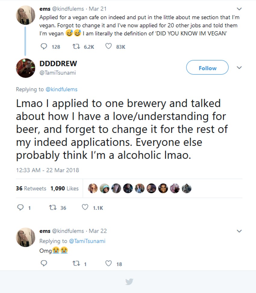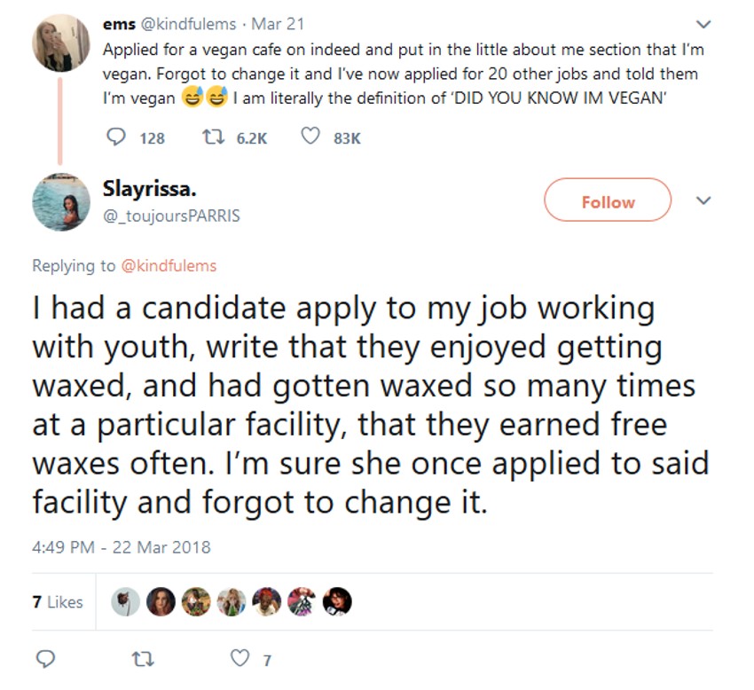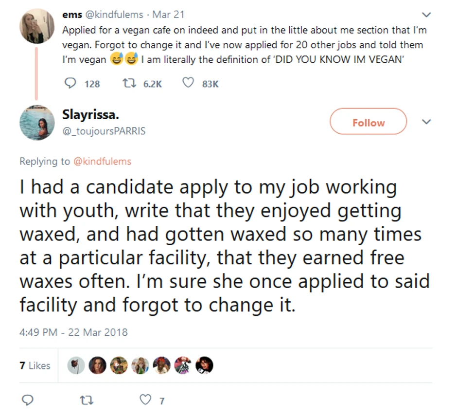 -Prijavljivala sam se za rad u veganskom kafiću i tamo sam napomenula da sam veganka. U međuvremenu sam zaboravila to da promenim te sam se prijavila na još 20 poslova i svima objavila da sam veganka. Doslovno sam definicija ljudi koji govore: Znaš da sam vegan?, napisala je nakon toga na Tviteru.
