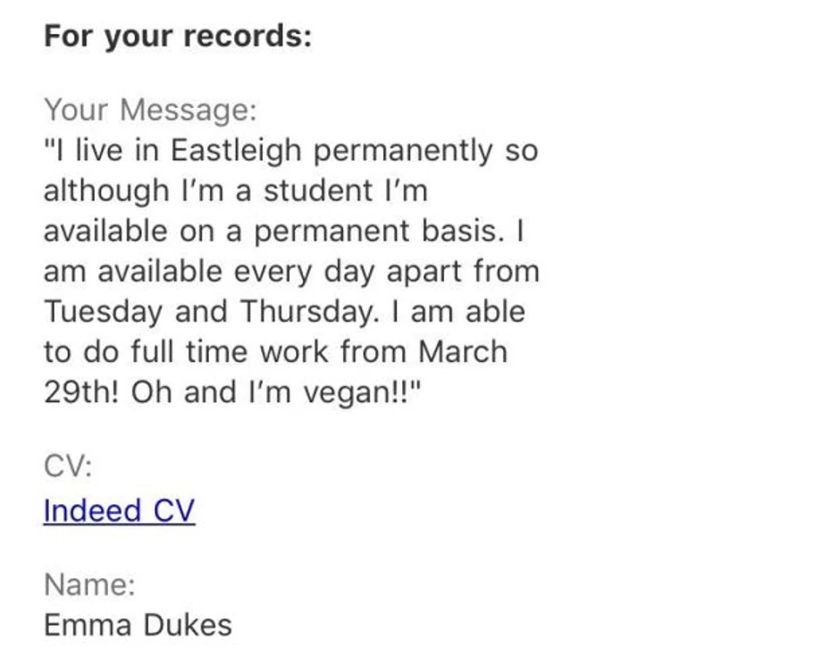 Ova 20-godišnjakinja iz Vinčestera pokušavala je da nađe posao kako bi zaradila koju funtu za finansiranje studija, a kad se prijavljivala na oglase preko stranice Indeed, svim potencijalnim poslodavcima dala je do znanja da je veganka.