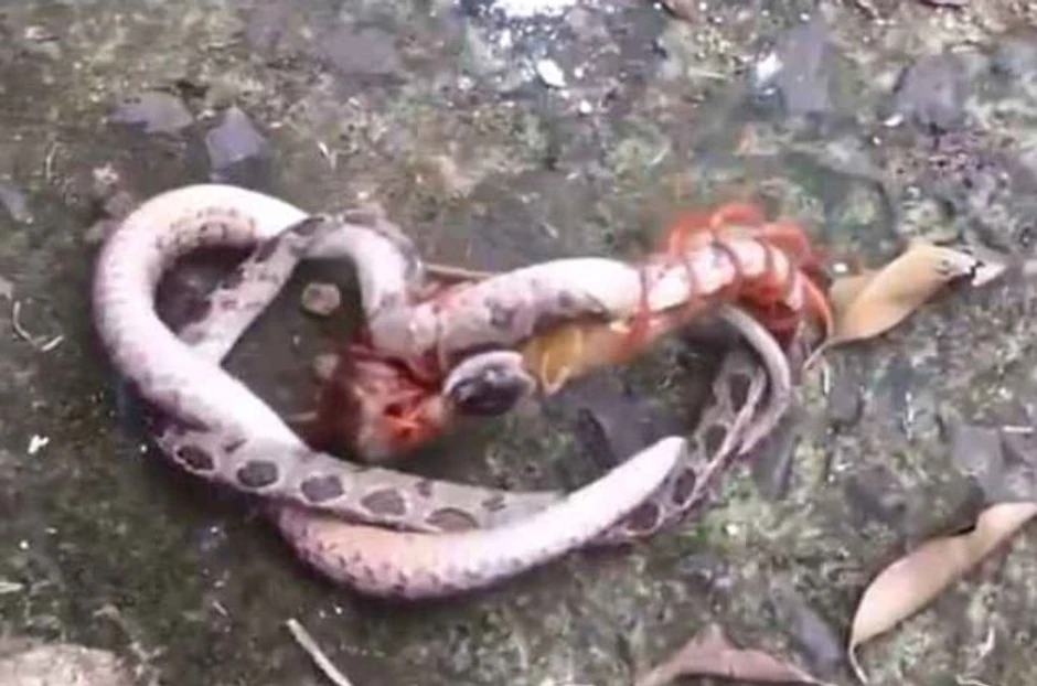 Ovo je trenutak kada se ogromna stonoga uhvati u koštac sa velikim pitonom u konačnoj bici do smrti. Objavljen na sajtu "Live Leak", snimak koji traje tri minuta prikazuje par koji se bori na zemlji u Vijetnamu.