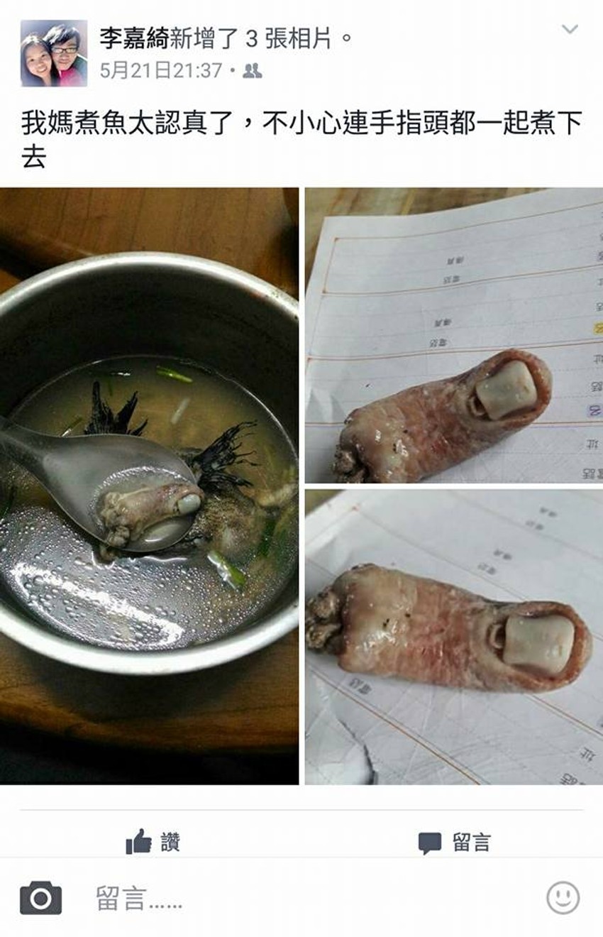 Li Jiaći iz Tajvana je sela za sto i krenula da jede omiljenu riblju čorbu koju joj je napravila majka, ali je zatim u njoj pronašla nešto što je ličilo na - ljudski prst!