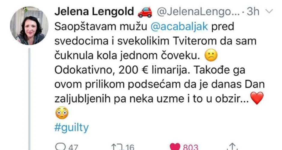 - Saopštavam mužu Aleksandru Baljaku pred svedocima i svekolikim Tviterom da sam čuknula kola jednom čoveku. Odokativno, 200 evra limarija. Takođe ga ovom prilikom podsećam da je danas Dan zaljubljenih pa neka uzme i to u obzir - napisala je ona uz dodala da je kriva.