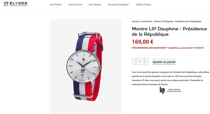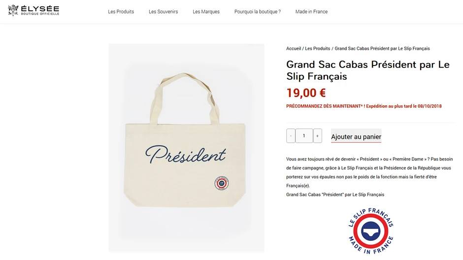 Onlajn prodaja na adresi https://boutique.elysee.fr obuhvata majice, satove, sveske, bedževe i olovke. Neke cene privlače posebnu pažnju - plava majica sa natpisom "predsednik" na grudima košta 55 evra.