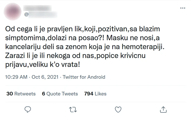 "Od čega li je pravljen lik, koji,pozitivan, sa blažim simptomima, dolazi na posao?! Masku ne nosi, a kancelariju deli sa ženom koja je na hemoterapiji. Zarazi li je ili nekoga od nas, popiće krivičnu prijavu, veliku k'o vrata!", započela je ova tviterašica iz Srbije priču o nehumanom i opasnom ponašanju kolege sa posla.