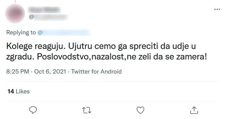 "Kolege reaguju. Ujutru ćemo ga sprečiti da uđe u zgradu. Poslovodstvo, nažalost, ne želi da se zamera!", objasnila je situaciju.