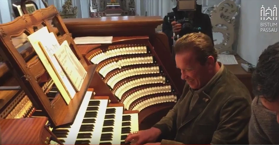 U društvu prijatelja iz Amerike i Nemačke, Arnold Švarceneger je neočekivano svratio u Katedralu u Pasauu, na granici nemačke pokrajine Bavarske i Austrije, gde su slušao podnevni koncert na najvećim orguljama na svetu.
