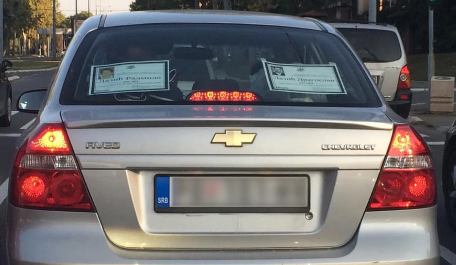 Na društvenim mrežama je osvanula fotografija automobila koji aktivno učestvuje u saobraćaju, na čijem se zadnjem delu nalaze dve umrlice, navodno preminulih supružnika.